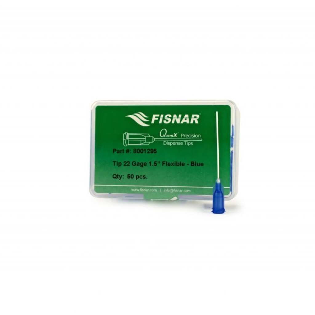 Fisnar QuantX™ 8001295 Blue flexible tips are for dispensing in hard to reach areas. Ends can be cut to remove any curing or customized to length. Suitable for Cyanoacrylates. 1 1/2 in x 22 ga.