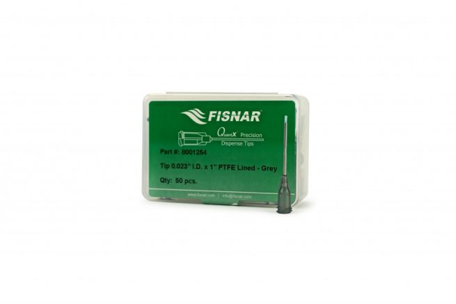 Fisnar QuantX™ 8001254 Gray stainless steel cannula tip with a PTFE insert lining that projects approximately 1/8 in from the cannula. PTFE tips are ideal for very low viscosity fluids, solvents and Cyanoacrylates. 1.37 in x 15 ga.